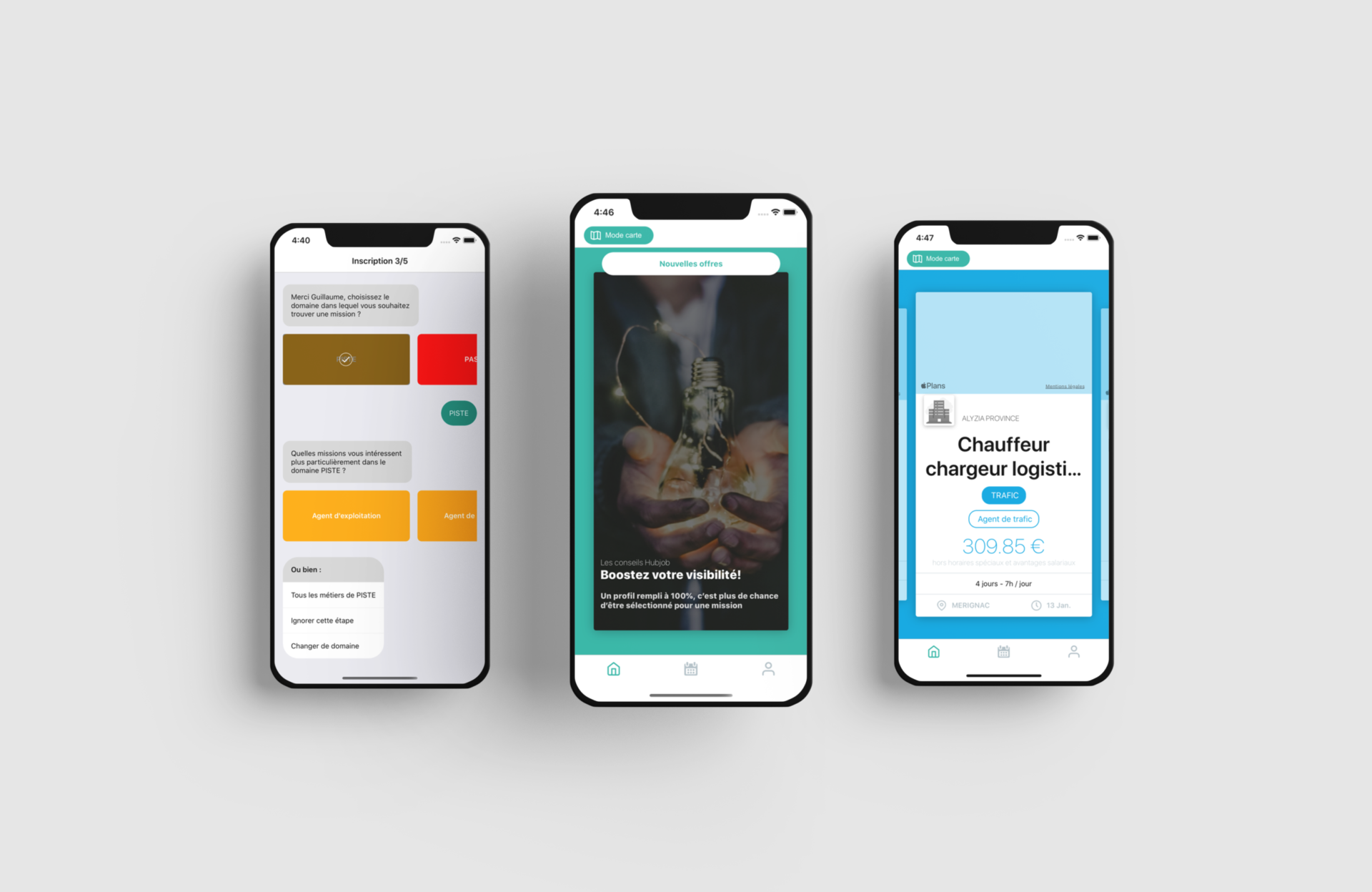 Hubjob est la toute première agence d’intérim virtuelle. Hubjob propose de dématérialiser l’ensemble des actes nécessaires à une embauche : de la mise en relation, en passant par les formalités, jusqu’à la paie. Le studio Slapp a ainsi développer deux solutions : une application web pour les employeurs, et une application mobile pour les intérimaires.
